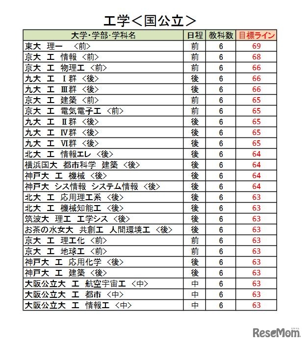 画像:駿台の情報をもとに作成 大学別合格目標ライン<国公立>工学系