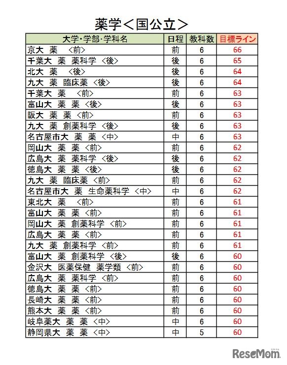 画像:駿台の情報をもとに作成 大学別合格目標ライン<国公立>薬学系