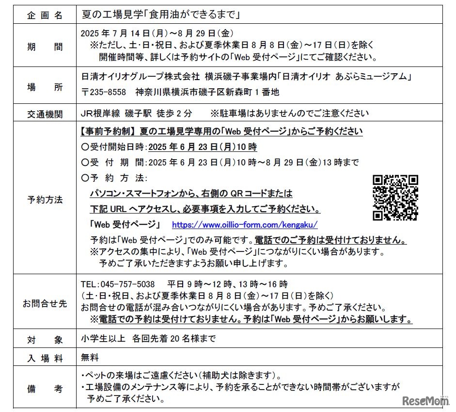 日清オイリオグループの横浜磯子工場では、食用油について広く知ってもらうために工場見学を実施している。見学は小学生以上が対象。事前予約制で、2025年6月23日午前10時から受付開始、各回先着20名まで。