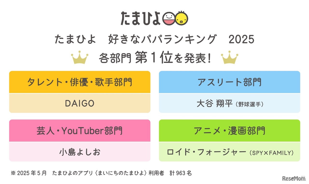 2025年6月11日、たまひよは、6月15日の父の日にちなみ「たまひよ 好きなパパランキング 2025」を発表した。タレント・俳優・歌手部門でDAIGOが、アスリート部門で大谷翔平が1位に輝いた。