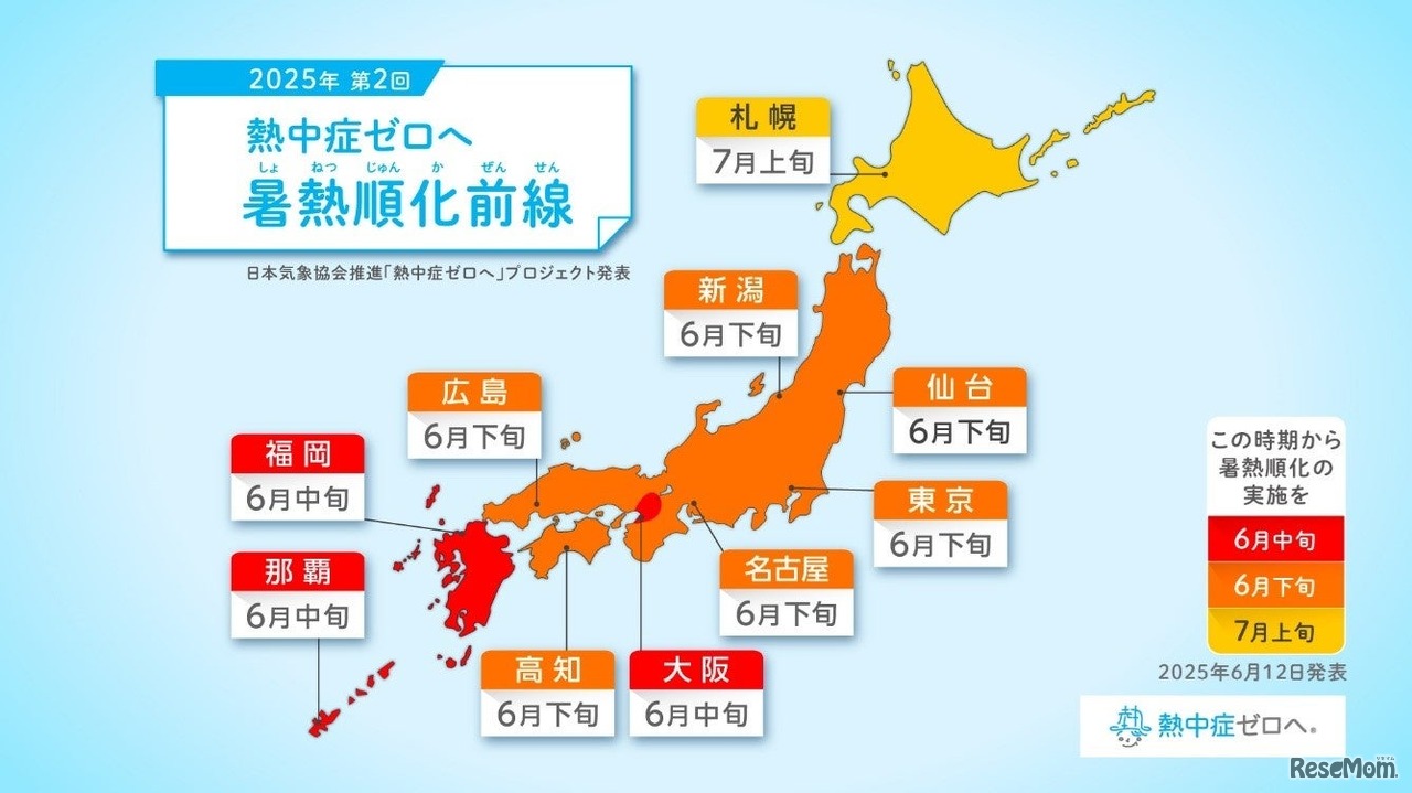 日本気象協会が推進する「熱中症ゼロへ」プロジェクトは、暑さに慣れることの重要性を広めるため、暑熱順化のタイミングを示す「暑熱順化前線」を発表した。