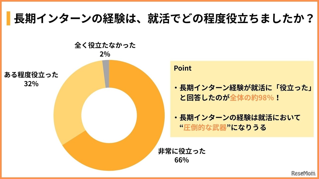 SHiROは2025年6月13日、長期インターンを経験した大学4年生対象の「就職活動における長期インターンの影響」に関するアンケート調査の結果を公表した。98%の学生が「長期インターンをやっていたからこそ、就活で他の学生と差をつけられた」と実感していることがわかった。