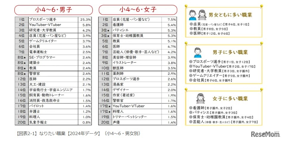 東京大学社会科学研究所とベネッセ教育総合研究所は2025年5月29日、共同で実施した「子どもの生活と学びに関する親子調査」の結果を発表した。将来なりたい職業についてのランキングについて、小学校4年~6年生の男子は「プロスポーツ選手」、女子は「店員(花屋・パン屋など)」がもっとも多かった。