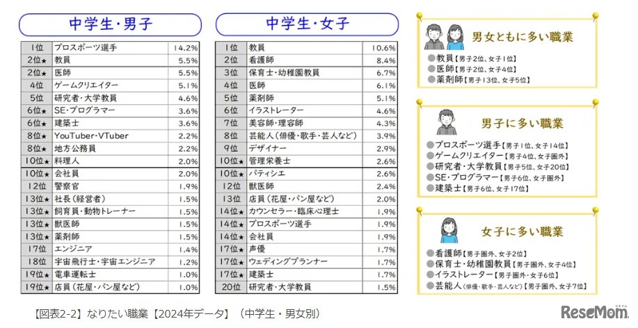 東京大学社会科学研究所とベネッセ教育総合研究所は2025年5月29日、共同で実施した「子どもの生活と学びに関する親子調査」の結果を発表した。将来なりたい職業についてのランキングについて、小学校4年~6年生の男子は「プロスポーツ選手」、女子は「店員(花屋・パン屋など)」がもっとも多かった。
