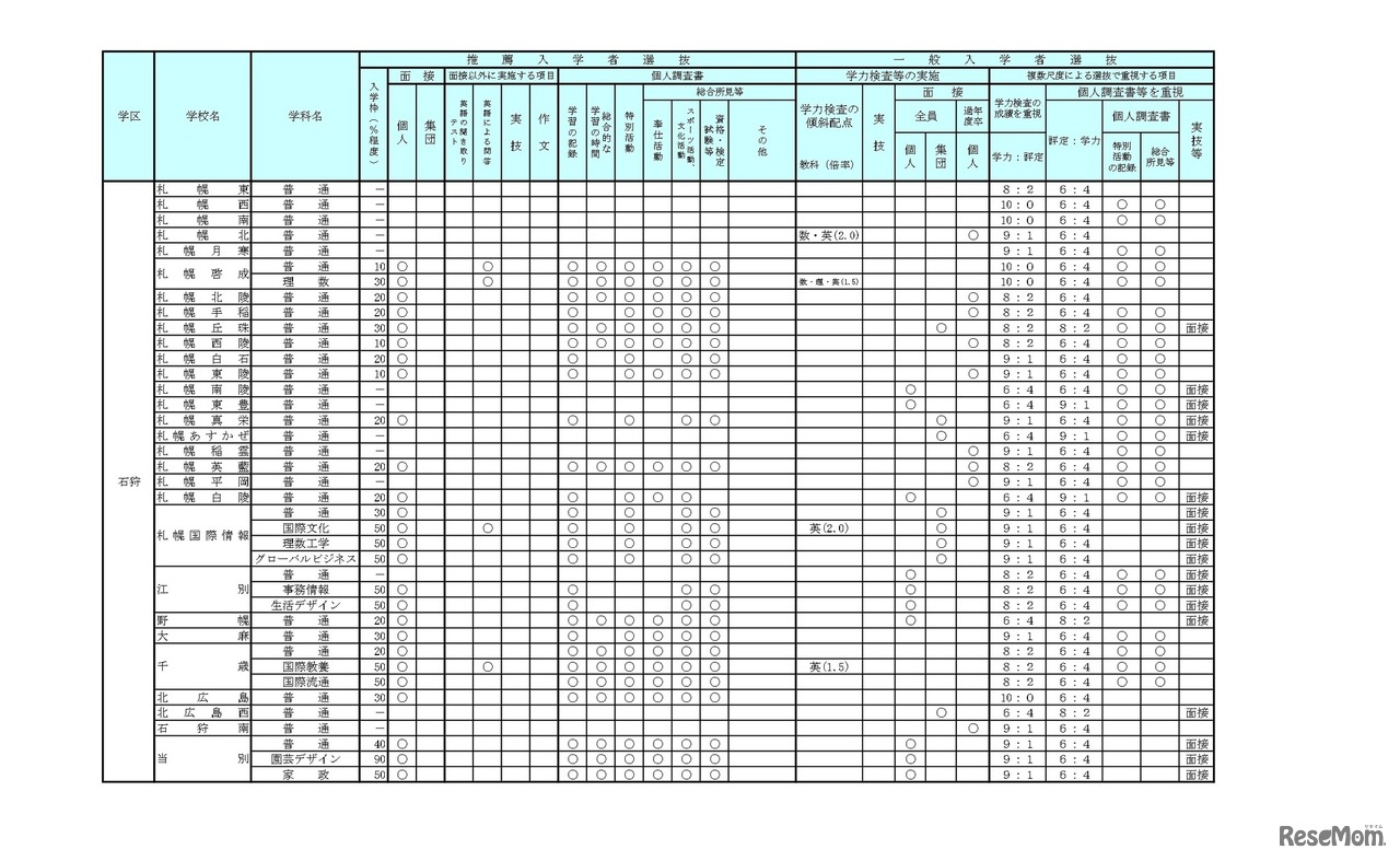 北海道教育委員会は2025年6月16日、2026年度(令和8年度)北海道公立高等学校入学者選抜における「学校裁量についての実施予定一覧表」「推薦入学者選抜実施校における全日制課程の『入学者の受入れに関する方針等』一覧表」などを公表した。学力検査の傾斜配点などをまとめている。