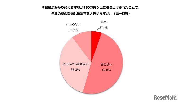 しゅふJOB総研は2025年6月17日、「所得税160万円への引き上げ」をテーマとした、仕事と家庭の両立を希望する主婦・主夫層対象のアンケート調査結果を発表した。所得税の課税最低限160万円への引き上げが「年収の壁」解決策になると「思う」はわずか5.4%、「思わない」は49.0%だった。