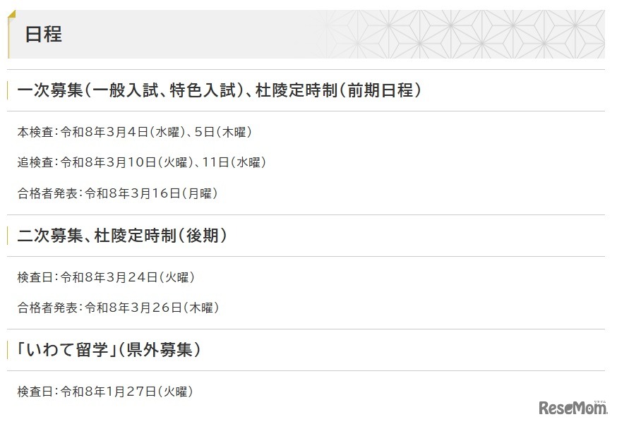 岩手県教育委員会は2025年6月11日、2026年度(令和8年度)岩手県立高等学校入学者選抜の日程を公表した。一次募集(一般入試、特色入試)の本検査を2026年3月4日と5日に実施し、3月16日に合格者を発表する。