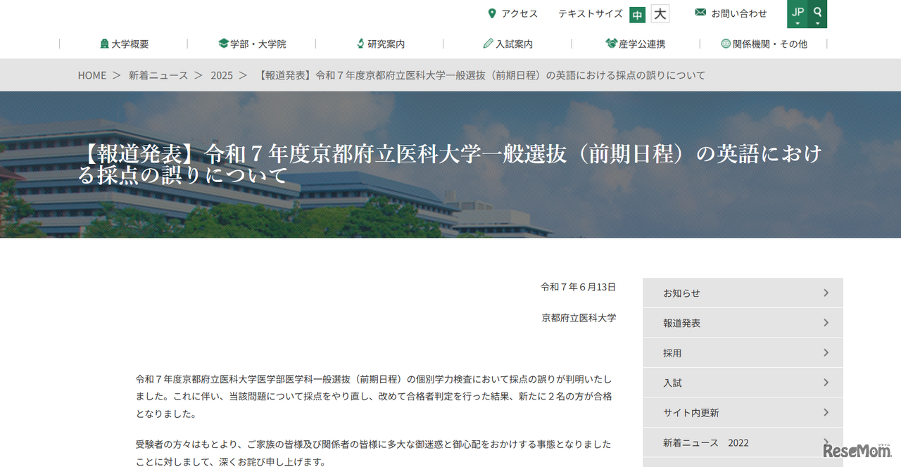 京都府立医科大学は2025年6月13日、2025年度入試で採点ミスがあり、新たに2人を追加合格にしたと発表した。2月25日実施の医学部医学科の一般選抜・前期の個別学力検査「英語」で、記述式の解答において採点のばらつきが発覚した。
