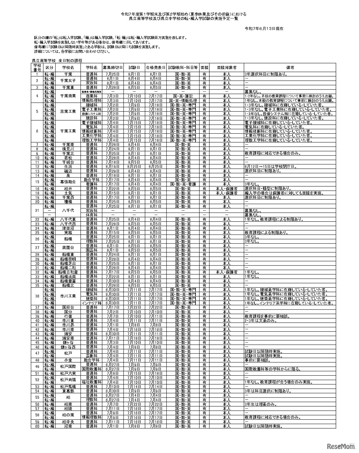 千葉県教育委員会は2025年6月13日、2025年度(令和7年度)第1学期末および第2学期始め(夏季休業およびその前後)における県立高等学校および県立中学校の転・編入学試験の実施予定について公表した。全日制高校118校、定時制16校、通信制1校で実施、県立中学校の実施はない。