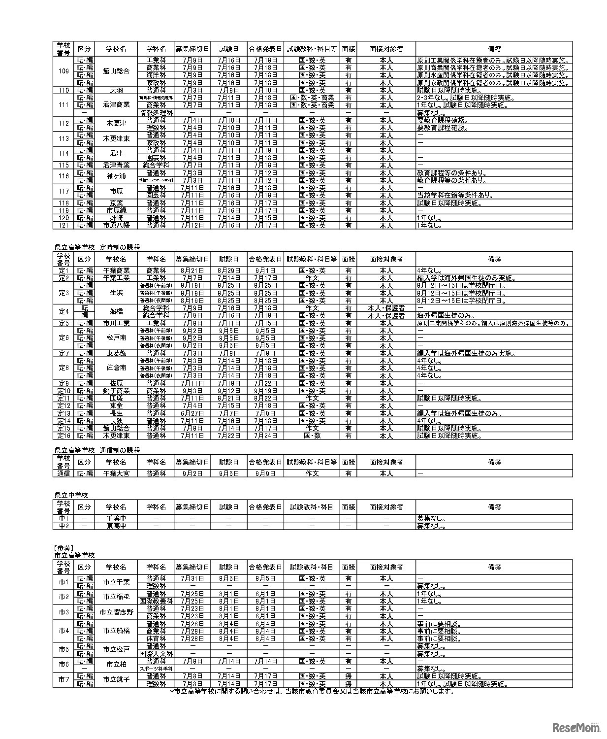 千葉県教育委員会は2025年6月13日、2025年度(令和7年度)第1学期末および第2学期始め(夏季休業およびその前後)における県立高等学校および県立中学校の転・編入学試験の実施予定について公表した。全日制高校118校、定時制16校、通信制1校で実施、県立中学校の実施はない。