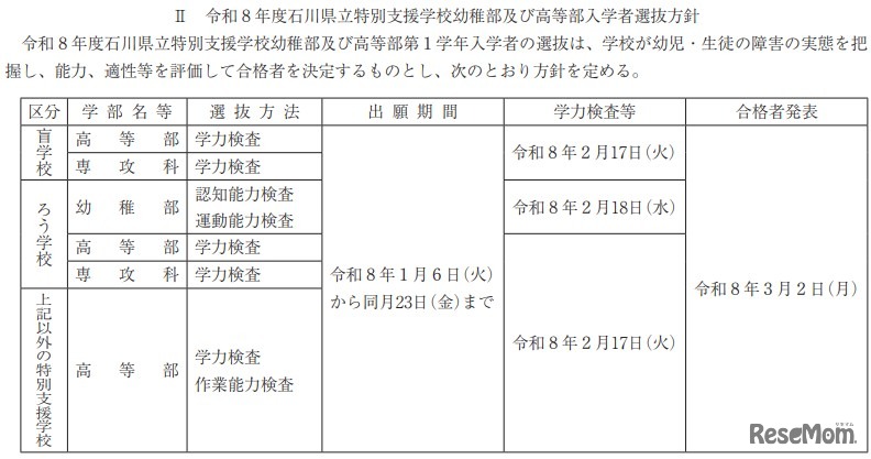 画像出典:石川県教育委員会 令和8年度石川県立特別支援学校幼稚部および高等部入学者選抜方針