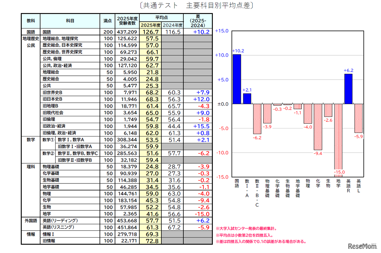 画像提供:駿台予備学校 2025年度共通テスト 主要科目別平均点