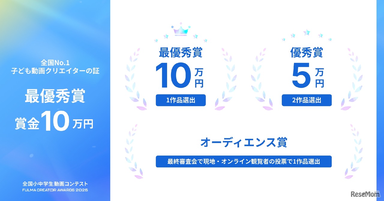 子供向け動画制作スクールを運営するFULMAは、全国の小中学生を対象に「全国小中学生動画コンテスト FULMA Creator Awards 2025」を開催する。応募作品は「考える力」「伝える力」「つくる力」の3つの項目で審査され、最優秀賞1作品には賞金10万円、優秀賞2作品には賞金5万円などが贈られる。締切りは8月31日。