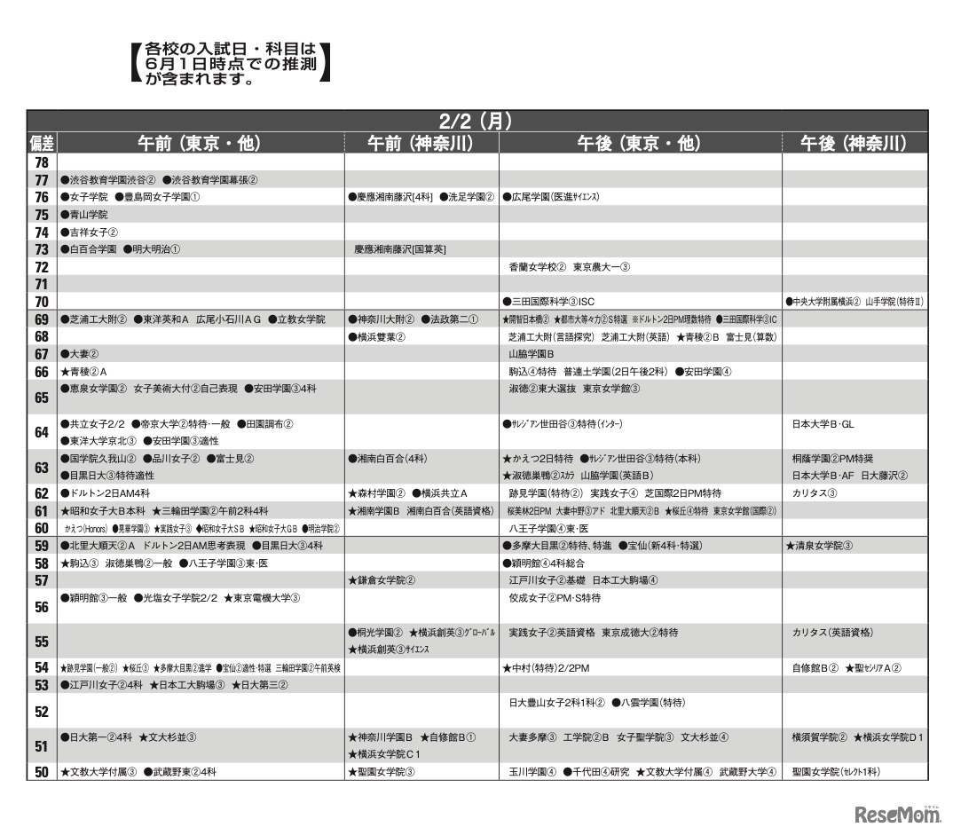 予想偏差値7月版(女子・2月2日)