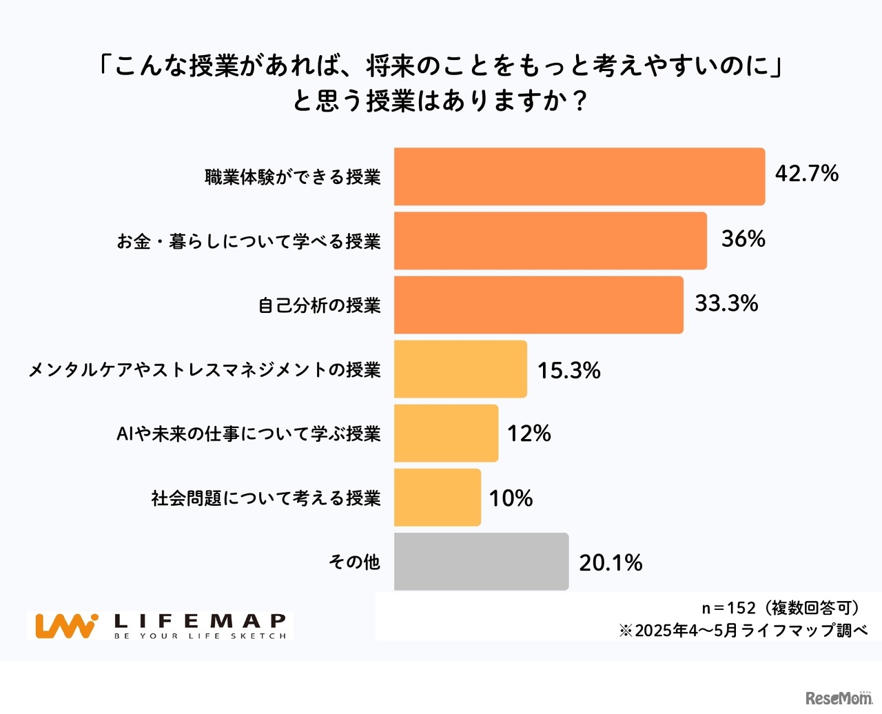 ライフマップは、全国の高校生152人を対象に実施した「将来に対する不安や考え方」についてのアンケート結果を公表した。高校生が将来について不安に思う社会問題のトップは「お金・物価の問題(収入や生活費など)」で60.5%を占めた。