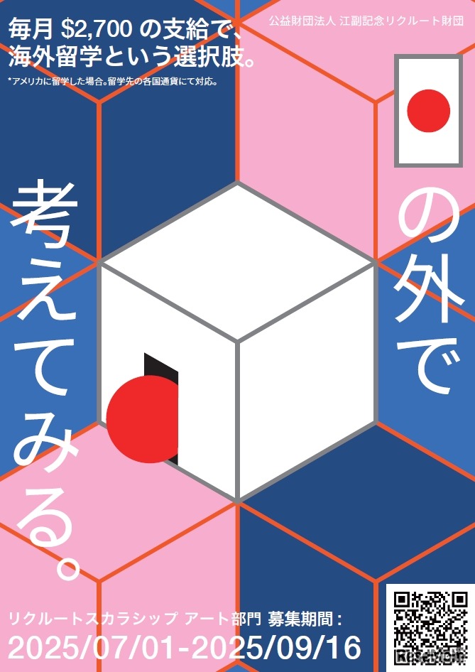 江副記念リクルート財団は2025年7月1日より、リクルートスカラシップのアート部門における奨学生募集を開始する。対象は、美術作家として作品制作を通じて社会に貢献することを目指し、海外の大学・院に進学する24歳以下の人。返済不要の奨学金を最大27歳になる年度末まで受給できる。