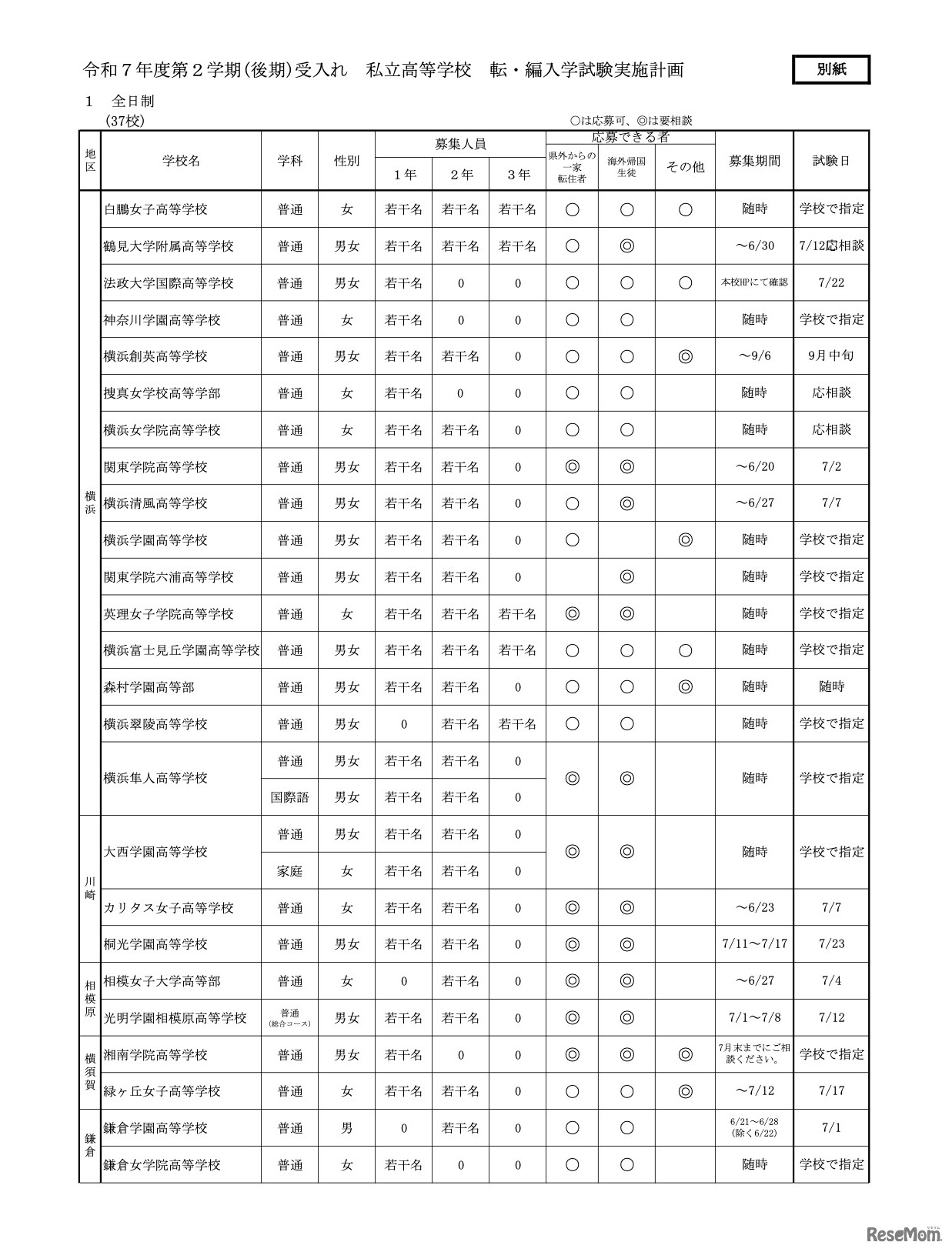 画像出典:神奈川県「令和7年度第2学期(後期)受入れ 私立中学・高等学校等 転・編入学試験実施計画」 全日制高校