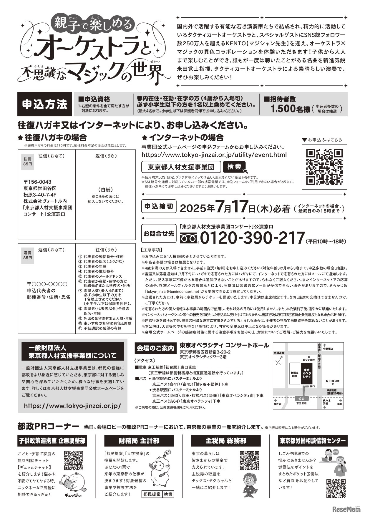 東京都人材支援事業団は2025年8月22日、親子で楽しむはじめてのコンサート「親子で楽しめるオーケストラと不思議なマジックの世界」を開催。親子1,500人を無料で招待する。対象は、都内在住・在勤・在学者で、4歳から入場可能。7月17日までWebサイトまたは往復はがきにて申込みを受け付ける。
