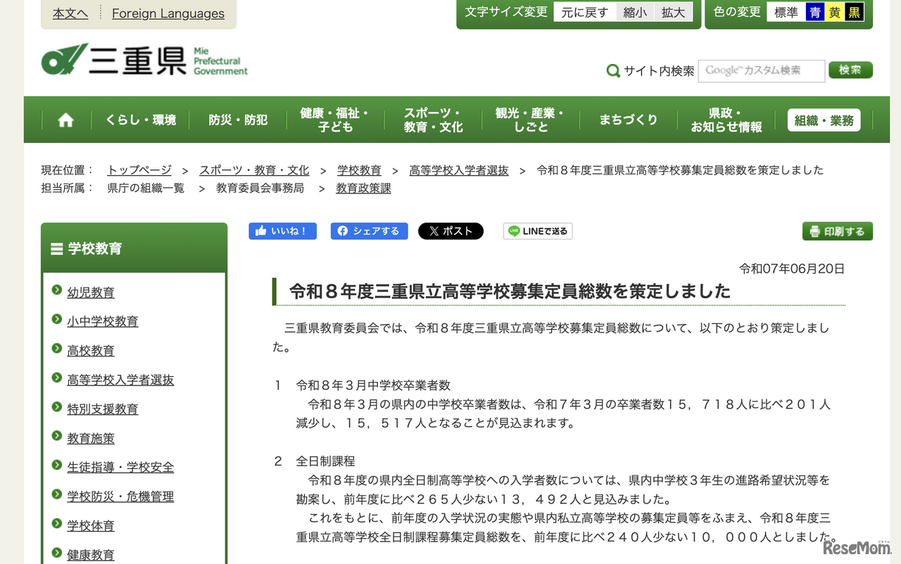 三重県教育委員会は2025年6月20日、2026年度(令和8年度)三重県立高等学校募集定員総数を公表した。全日制課程の募集定員は1万人で、前年度より240人減となる。中学3年生の進路希望状況等によると、全日制への入学者数が前年度より265人減少する見込みだという。