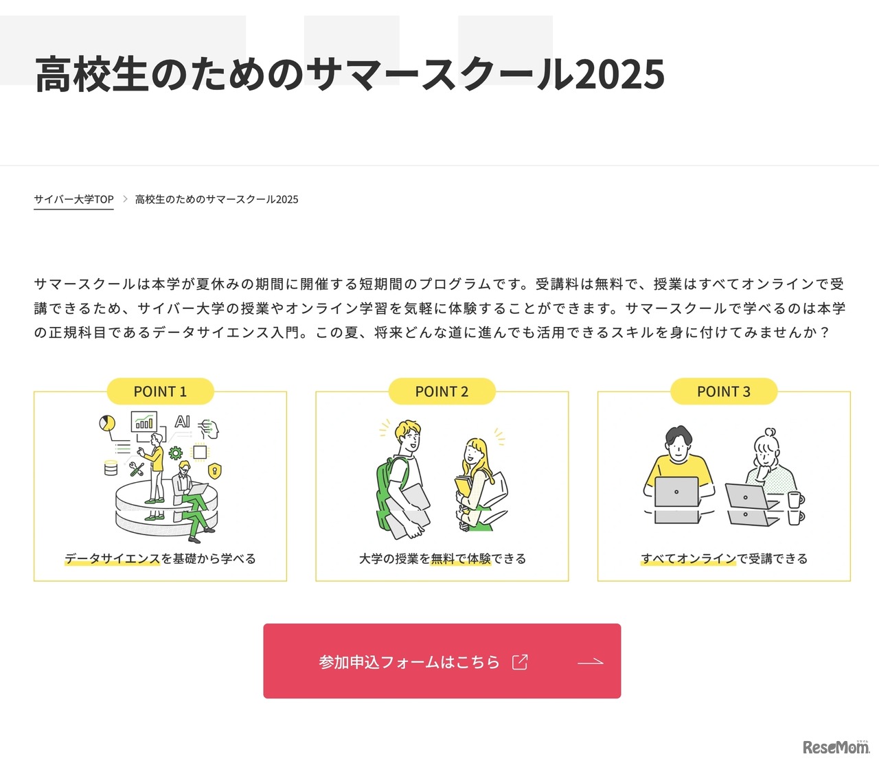 サイバー大学は2025年6月23日、「高校生のためのサマースクール2025」第1期生の募集を開始した。同大の正規科目である「データサイエンス入門」を無料で受講できるオンラインプログラム。第1期生の申込締切は7月7日。受講期間は8月1日~9月30日まで。