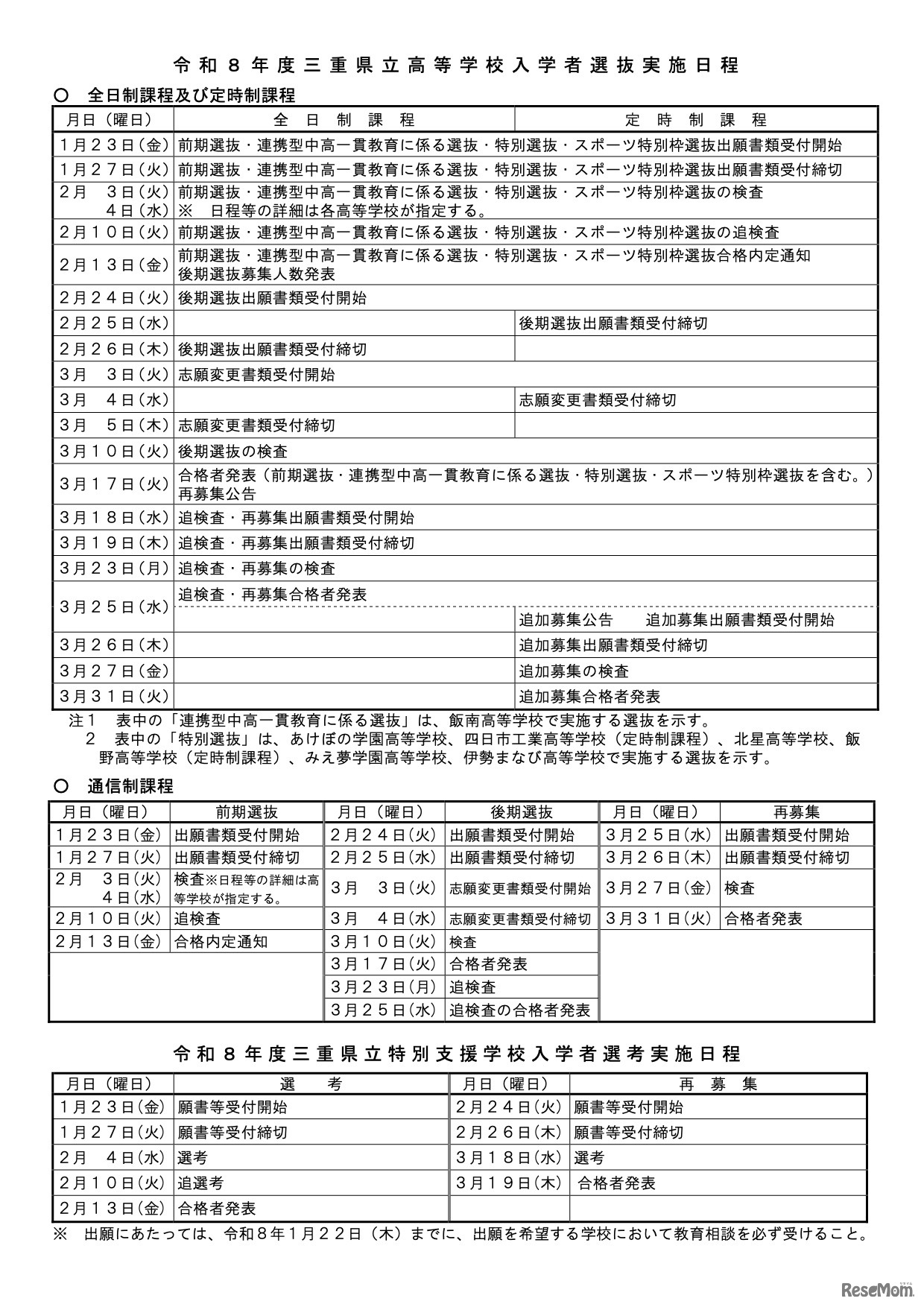 三重県教育委員会は2025年6月25日、2026年度(令和8年度)県立高等学校入学者選抜と県立特別支援学校入学者選考の実施日程を公表した。前期選抜の検査は2026年2月3日・4日、後期選抜の検査は3月10日に実施。特別支援学校の入学者選考は2月4日に行われる。