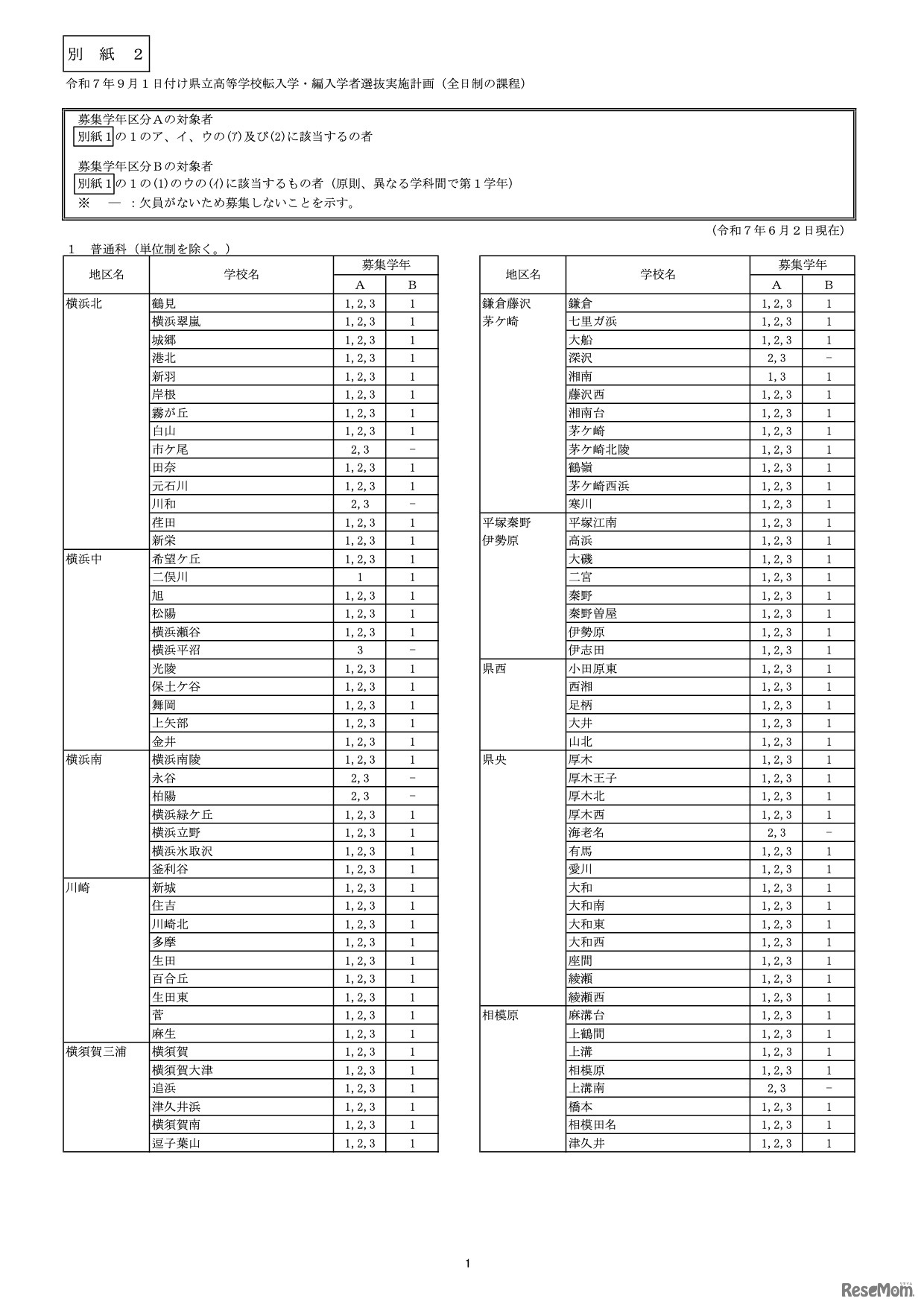 神奈川県教育委員会は2025年6月26日、県内公立高校の転・編入学者選抜について公表した。全日制における9月1日付け受入れの選抜は、県立130校、市立14校で実施。学力検査等は県立が8月20日、市立は8月20日または25日に行う。
