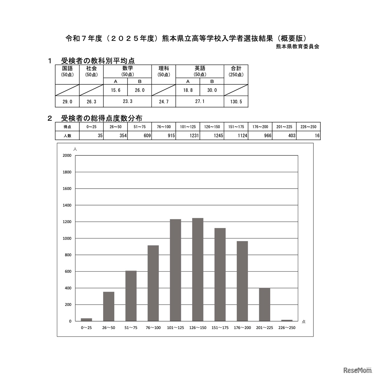 熊本県教育委員会は2025年6月30日、2025年度(令和7年度)県立高等学校入学者選抜結果(概要版)について公表した。5教科の総合平均点は130.5点で、前年度(2024年度)より8.4点上昇した。選抜結果は熊本県教育委員会のWebサイトに掲載されている。
