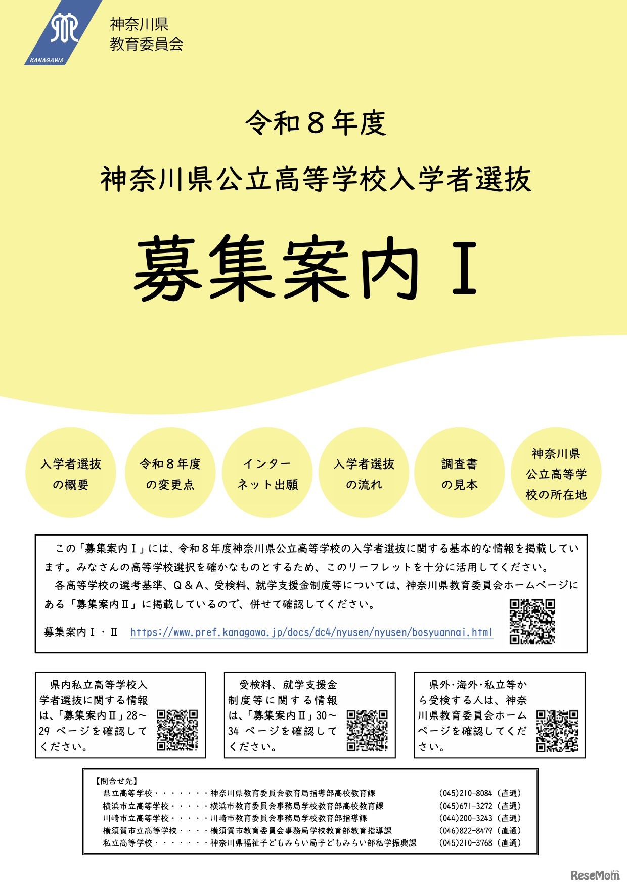 神奈川県教育委員会は2025年7月1日、2026年度(令和8年度)神奈川県公立高等学校入学者選抜について、「募集案内I」と「募集案内II」を公表した。「募集案内I」には入学者選抜に関する基本的な情報を掲載。「募集案内II」には、各高校の選考基準やQ&A、受検料、就学支援金制度等について掲載している。