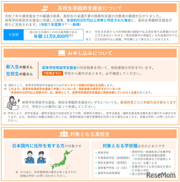 2025年度より国公立高校の授業料が所得制限なく無償化、さらに2026年度からは私立高校の全国平均授業料相当の45万7,000円を上限に支給される方針で、全世帯を対象に私立高校の授業料も実質無償化される方向だ。