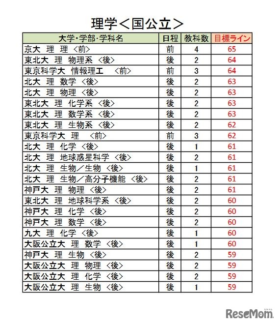 画像:駿台の情報をもとに作成 大学別合格目標ライン<国公立>理学系