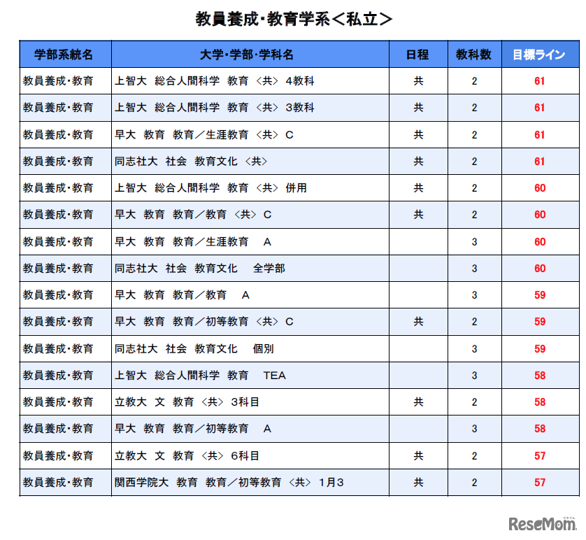 画像:駿台の情報をもとに作成 大学別合格目標ライン<私立>教員養成・教育学系