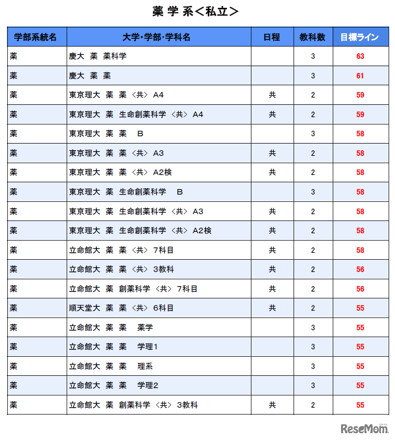 画像:駿台の情報をもとに作成 大学別合格目標ライン<私立>薬学系