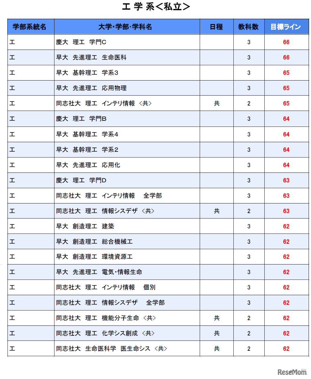 画像:駿台の情報をもとに作成 大学別合格目標ライン<私立>工学系