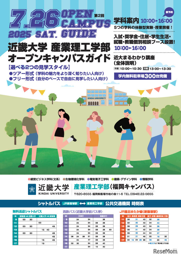 近畿大学産業理工学部(福岡県飯塚市)は、2025年7月19日と26日にオープンキャンパスを開催する。参加者がツアー形式とフリー形式を事前に選べる「ハイブリッド型オープンキャンパス」で実施。事前予約制で、締切りは各開催日3日前まで。