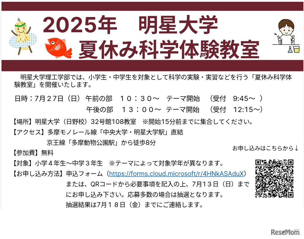 明星大学理工学部は2025年7月27日、小中学生を対象に「夏休み科学体験教室」を日野校にて開催する。当日は、10種類の科学の実験や実習プログラムを実施する。参加費は無料、申込みは7月13日まで。