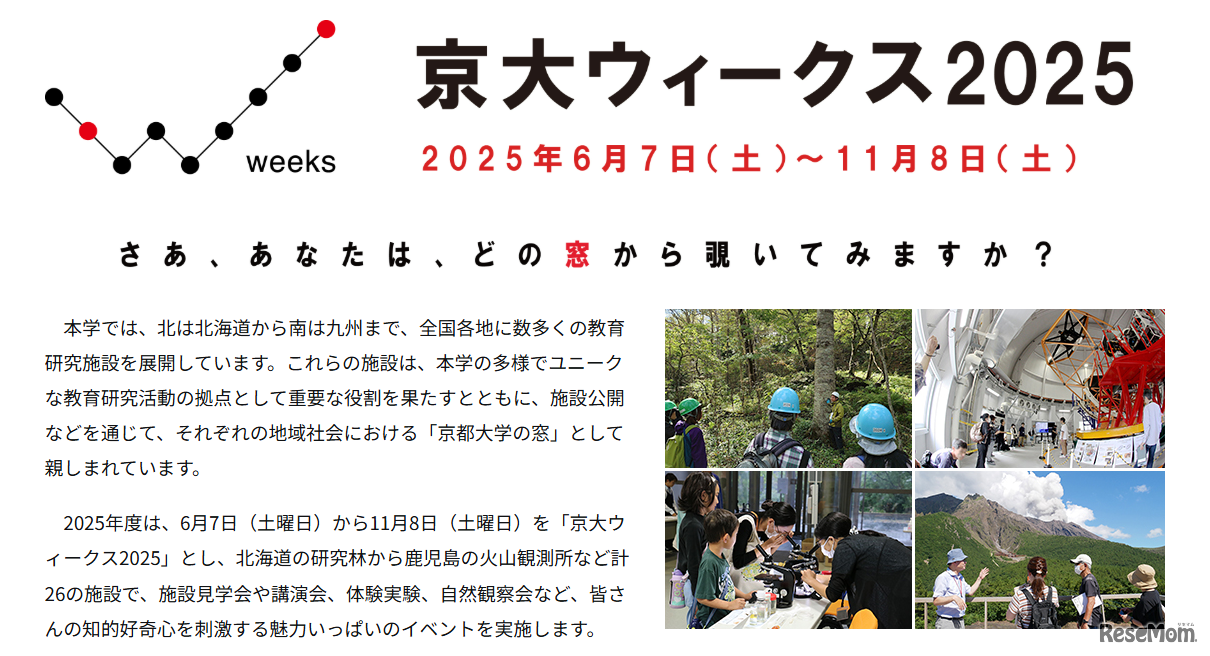 京都大学の多様でユニークな教育研究を支える施設の特別公開イベント「京大ウィークス」。2025年は11月8日までの期間、北海道の研究林から鹿児島の火山観測所など全国26施設で講演会、体験実験、自然観察会など、知的好奇心を刺激する魅力いっぱいのイベントが開催される。