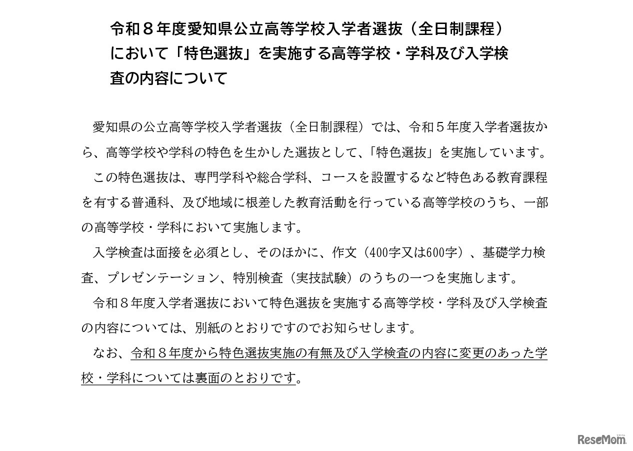愛知県教育委員会は2025年7月7日、2026年度(令和8年度)愛知県公立高等学校入学者選抜(全日制課程)における特色選抜を実施する高等学校・学科および入学検査の内容について公表した。