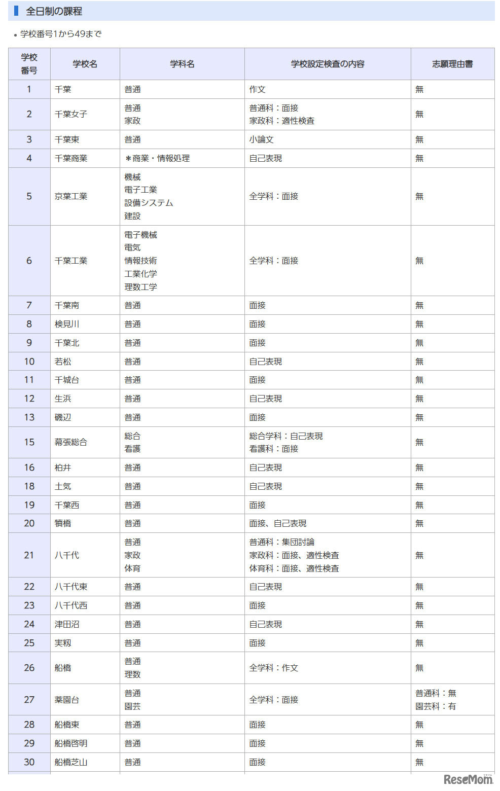 千葉県教育委員会は2025年7月9日、2026年度(令和8年度)千葉県公立高等学校入学者選抜「一般入学者選抜」等における学校設定検査の内容を公表した。全日制のうち学校設定検査で面接を実施するのは、73校118学科。志願理由書は全日制3校3学科が提出を求める。