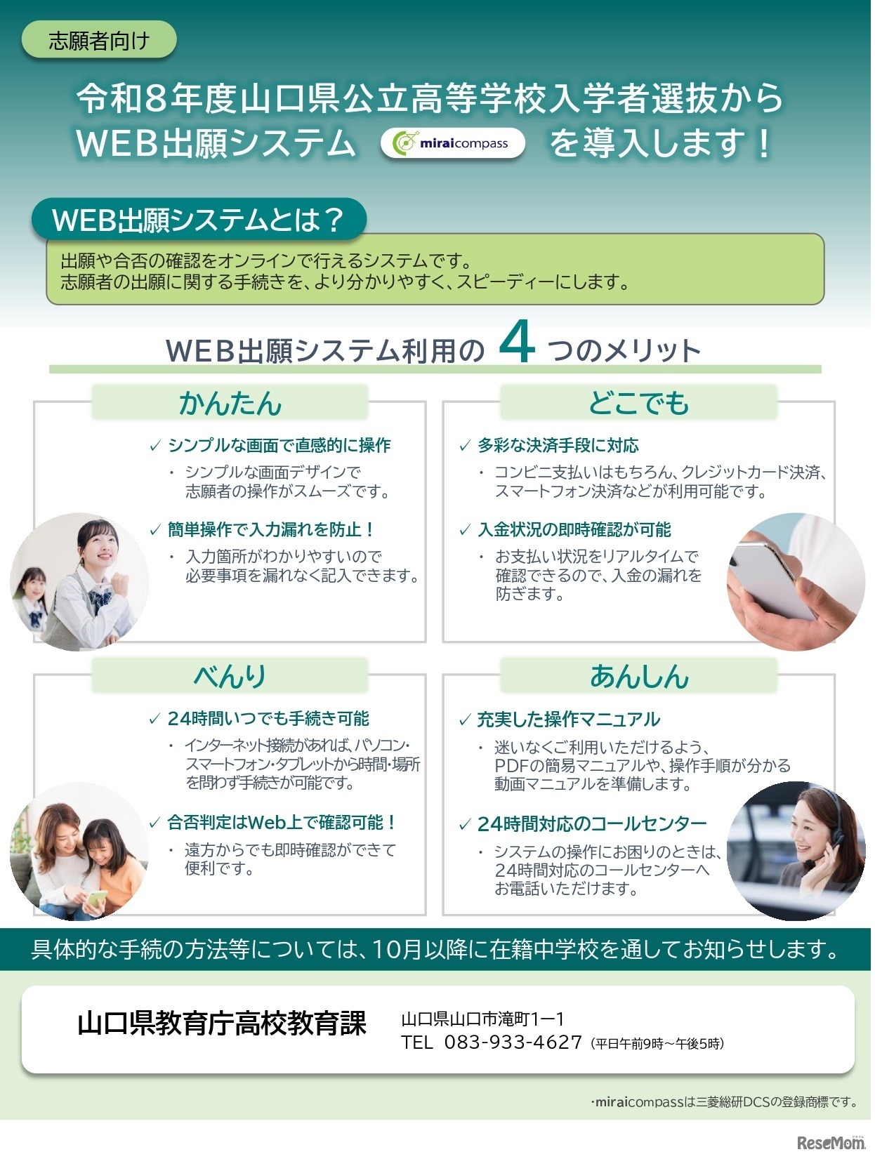 山口県教育委員会は2025年7月8日、2026年度(令和8年度)山口県公立高等学校入学者選抜においてWeb出願システムを導入することを公表した。出願や合否の確認をオンラインで行うことで、手続きがよりわかりやすくスピーディーになるという。