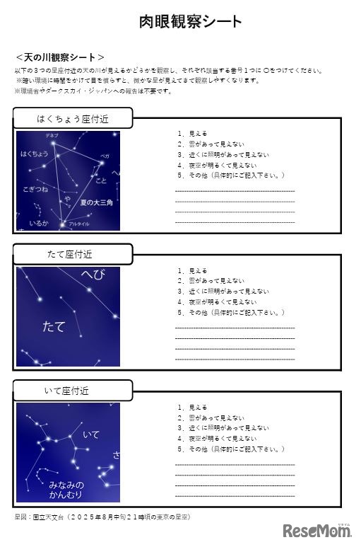 肉眼観察シート「天の川観察シート」