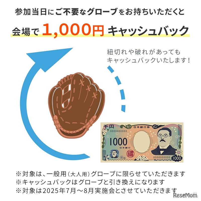 不要グローブ持参・引き換えで、現金1,000円キャッシュバック
