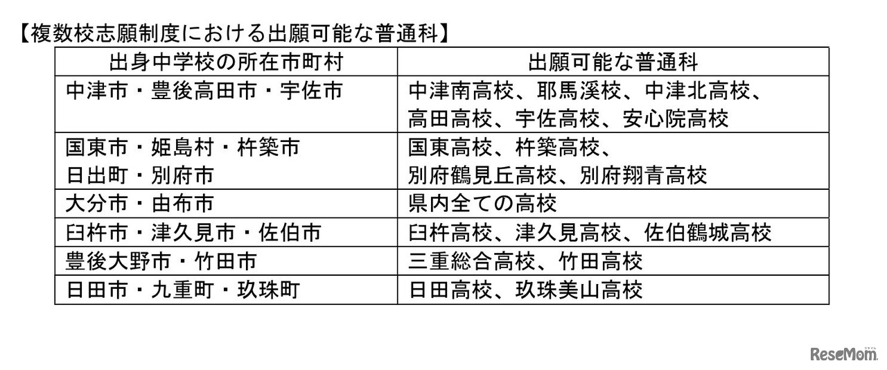 画像出典:大分県教育委員会 複数校志願制度における出願可能な普通科