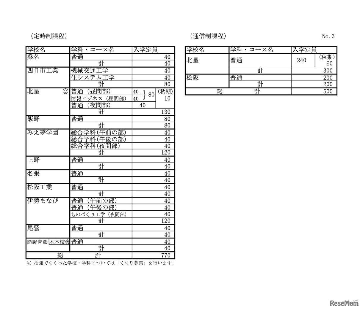 画像出典:三重県教育委員会 令和8年度三重県立高等学校入学定員(高校別の定員)