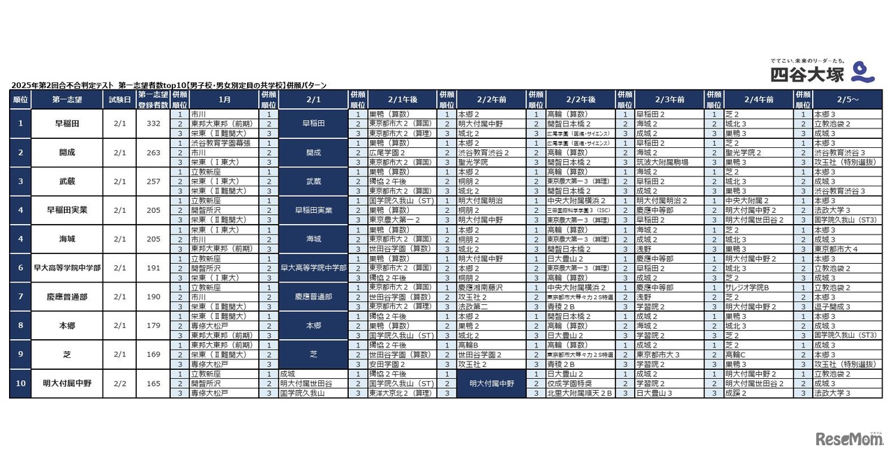 四谷大塚は2025年7月8日、「第2回合不合判定テスト」の第一志望登録者数トップ10の併願パターンを公開した。男子校、女子校、共学校それぞれの第一志望登録者数トップ10校を取り上げ、日程別に上位3位までの併願パターンを紹介している。