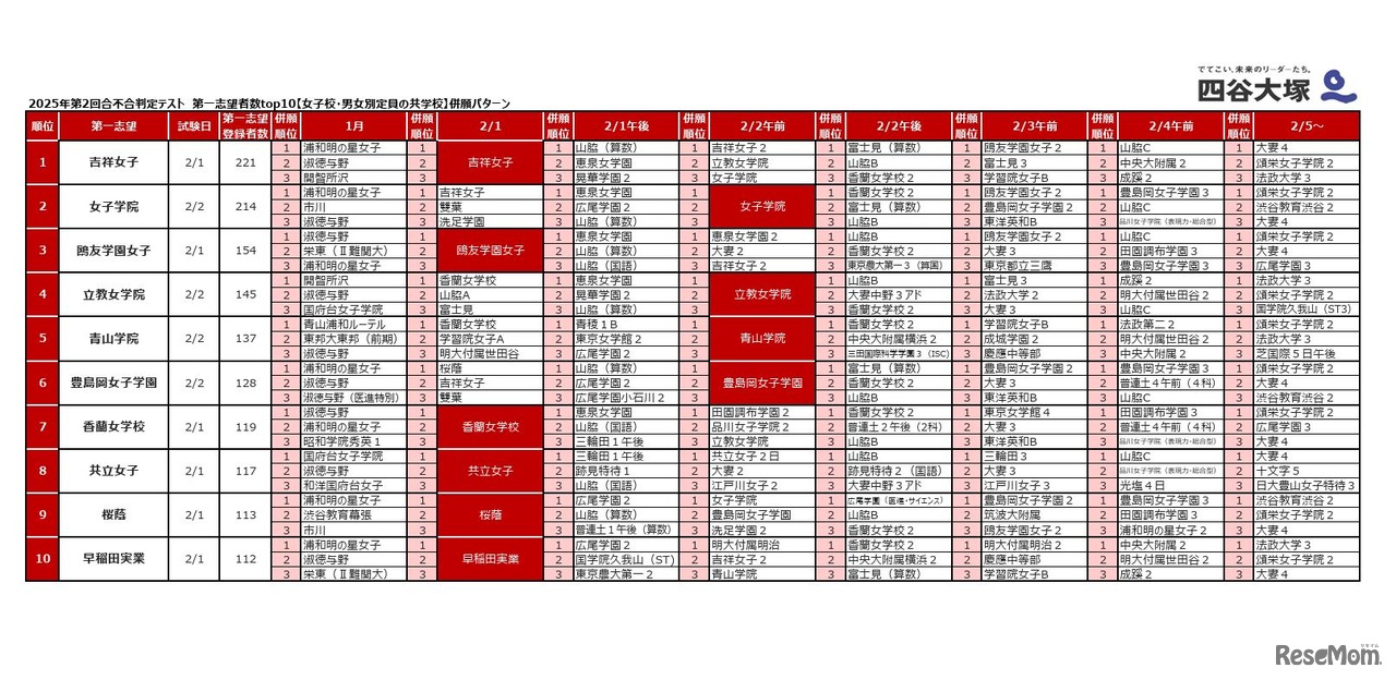 四谷大塚は2025年7月8日、「第2回合不合判定テスト」の第一志望登録者数トップ10の併願パターンを公開した。男子校、女子校、共学校それぞれの第一志望登録者数トップ10校を取り上げ、日程別に上位3位までの併願パターンを紹介している。
