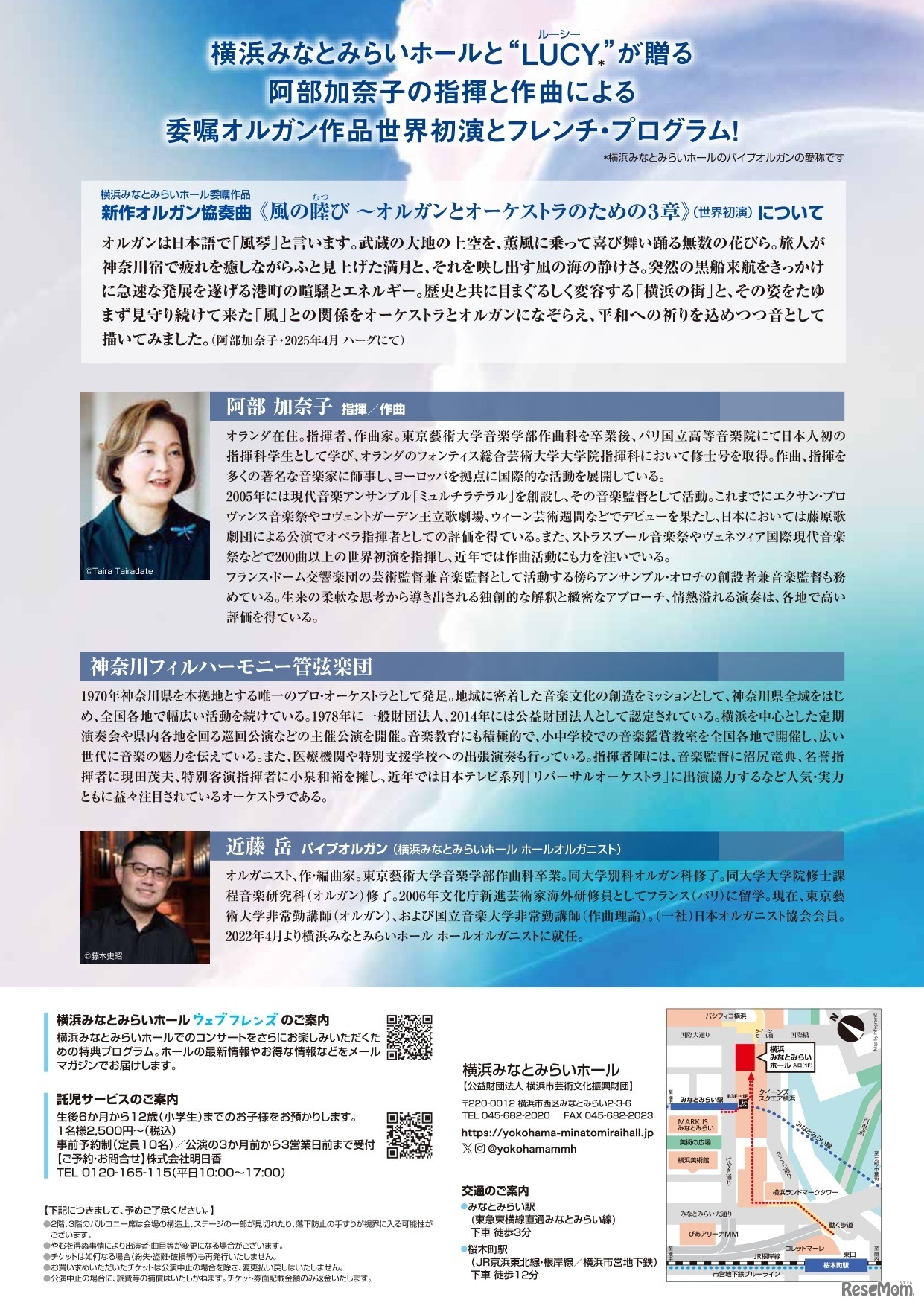 横浜みなとみらいホールは、2025年11月1日「阿部加奈子 指揮/作曲 横浜みなとみらいホール特別演奏会~オルガン“LUCY”プロジェクト~」と11月16日「第43回横浜市招待国際ピアノ演奏会」の2公演に、小学生から18歳以下の子供を無料招待する。保護者など同伴者のチケット代は半額になる。