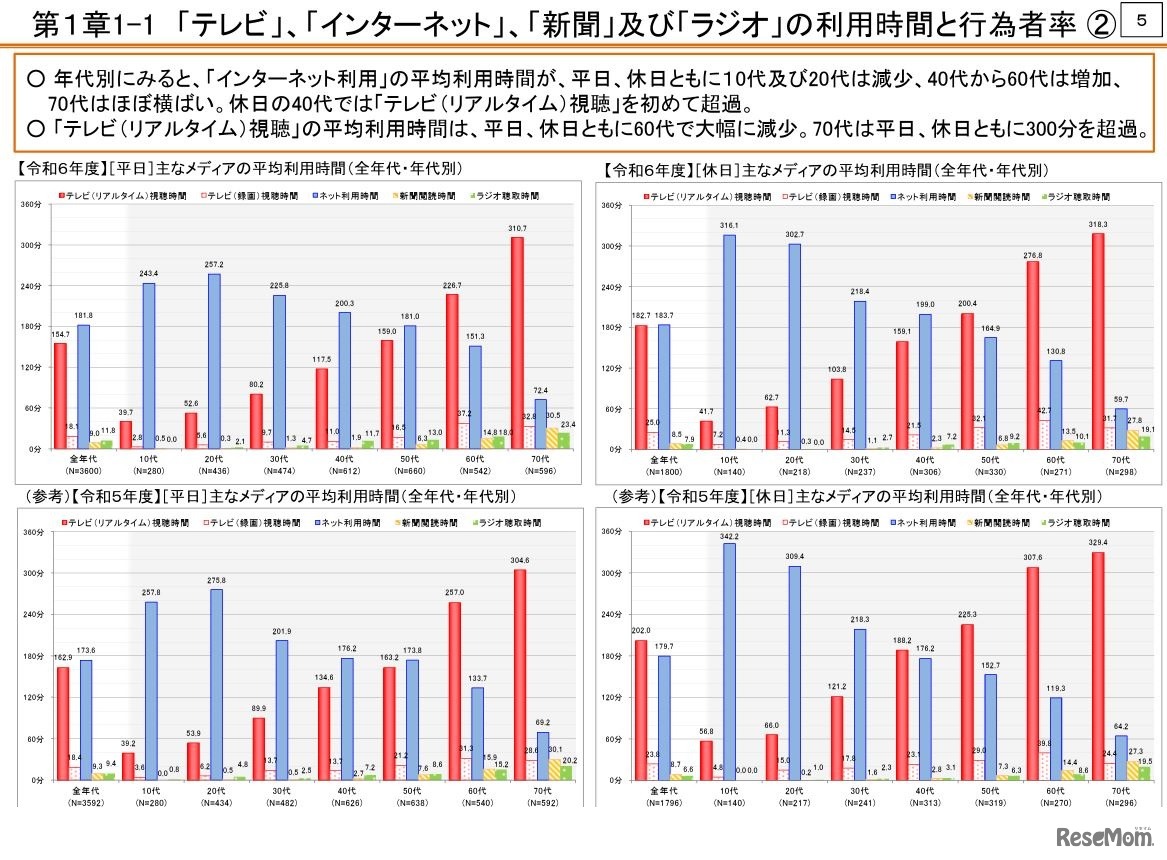 おもなメディアの平均利用時間は、平日・休日とも「インターネット」がもっとも長く、ついで「テレビ(リアルタイム)視聴」という傾向が続いていることが2025年6月27日、総務省情報通信政策研究所が公表した「2024年度(令和6年度)情報通信メディアの利用時間と情報行動に関する調査報告書」からわかった。