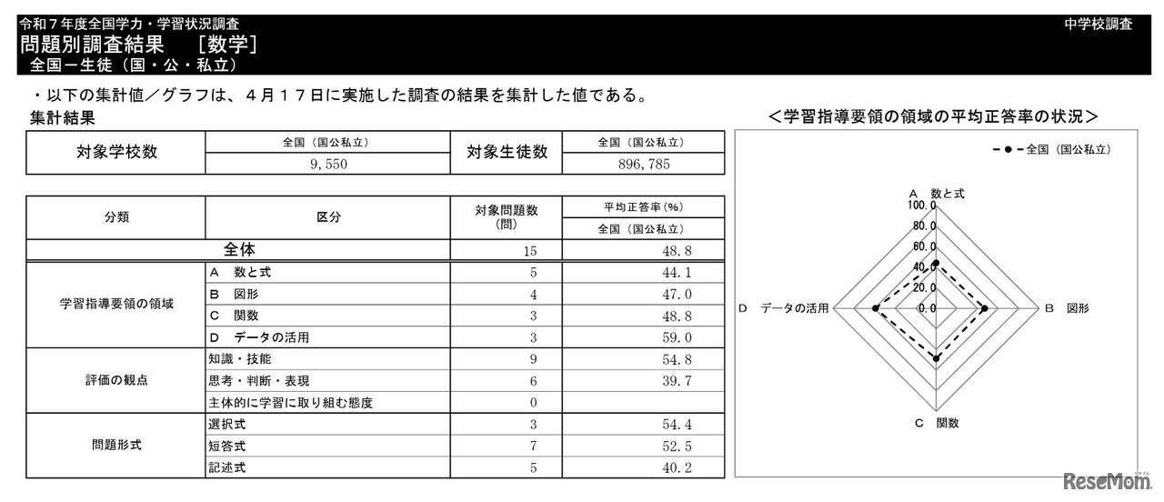 文部科学省は2025年7月14日、2025年度(令和7年度)全国学力・学習状況調査(全国学力テスト)の結果を公表した。国語と算数・数学の平均正答率は、小学校・中学校ともに前年度を下回った。初めてCBT形式で実施した中学校理科は、平均正答率ではなく、平均IRT(項目反応理論)スコアが示された。