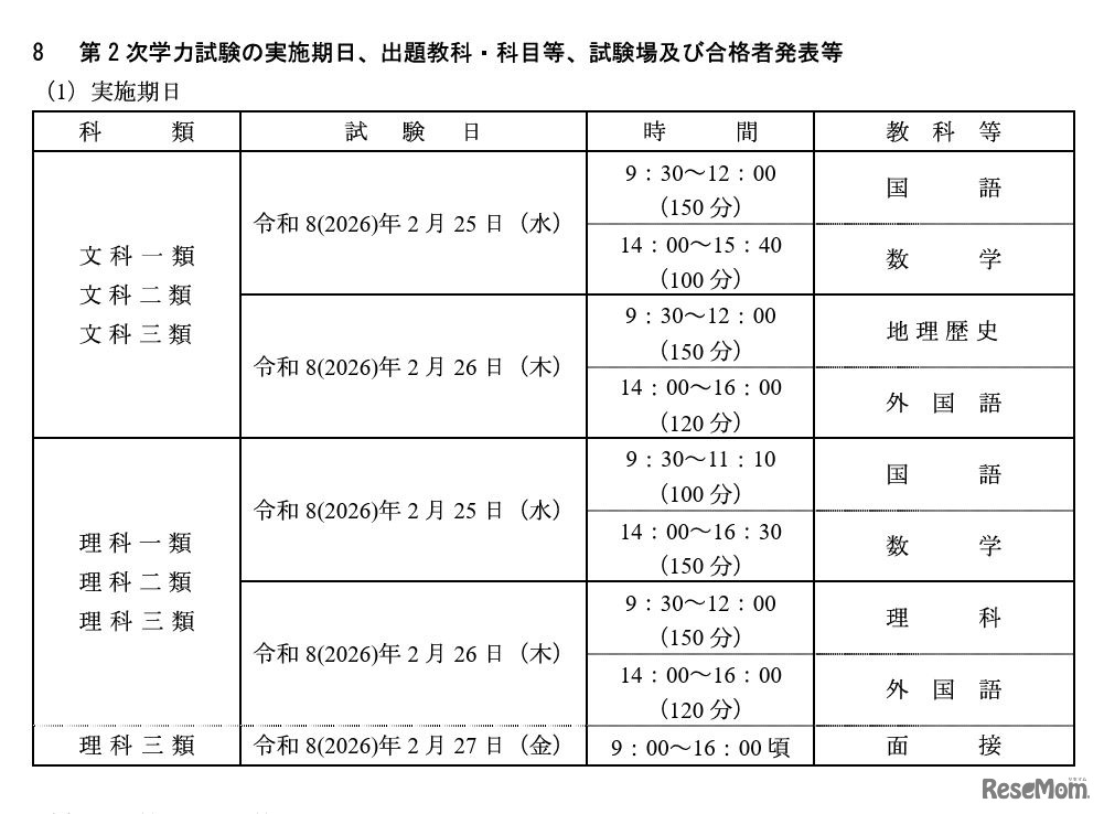 画像出典:東京大学「令和8(2026)年度東京大学入学者選抜要項」 第2次学力試験の実施期日、出願教科・科目等、試験場、合格者発表等