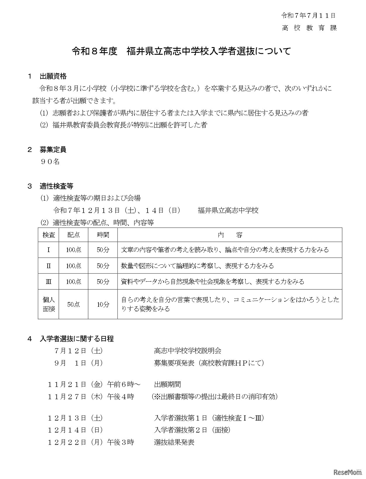 福井県教育委員会は2025年7月11日、2026年度(令和8年度)福井県立高志中学校の入学者選抜について公表した。募集定員は90名。出願期間は11月21日午前6時より。適性検査などは12月13日と14日。選抜結果は12月22日午後3時に発表する。